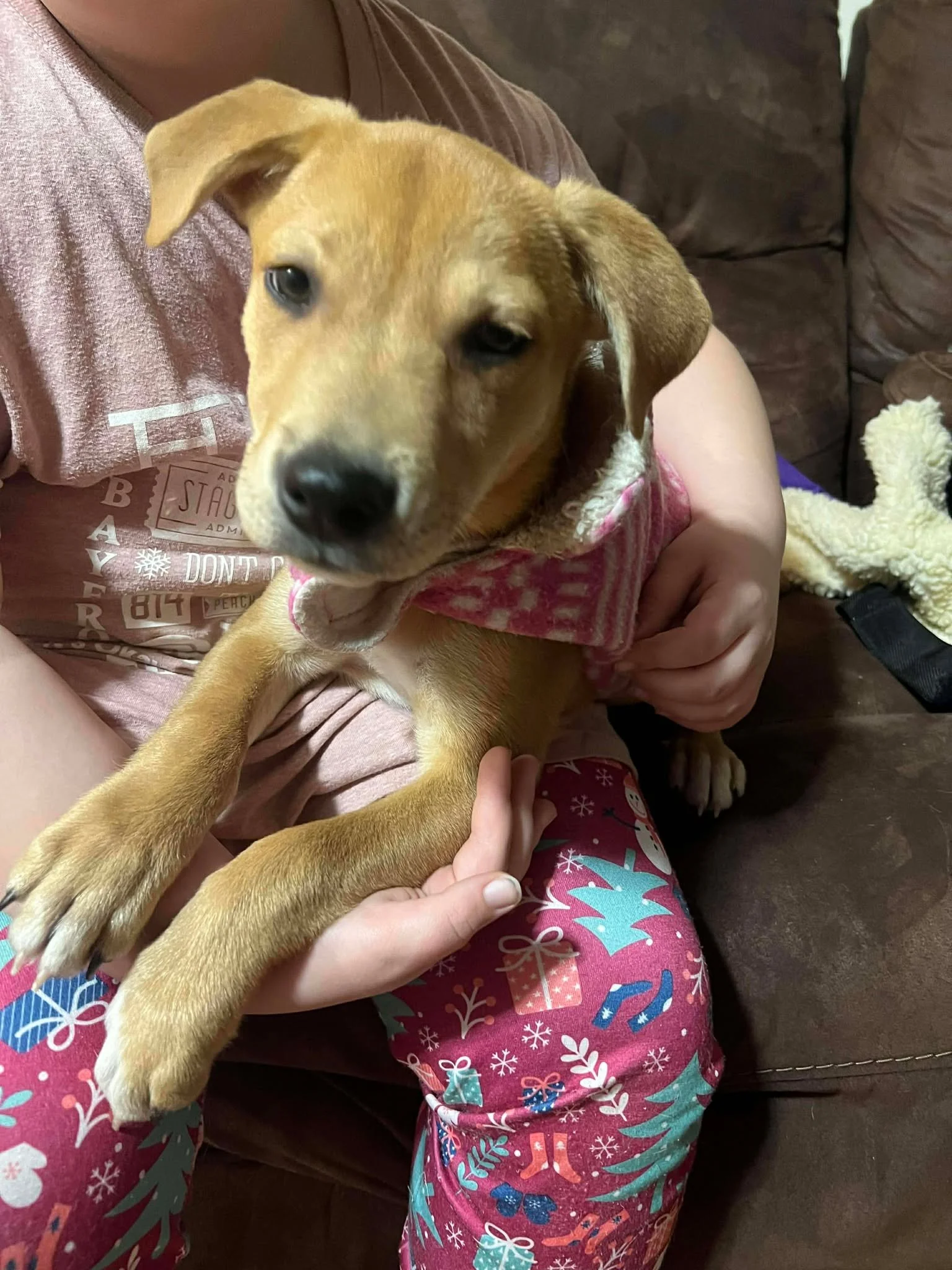 Age: 11 Weeks Old • Female • Mixed Breed (Likely Black Mouth Cur Mix)Daiquiri is one of those special puppies who lights up every room she enters. With her beautiful golden-and-white coat and the most expressive ears imaginable, she captures hearts instantly. But it’s her gentle, joyful personality that truly makes her unforgettable.