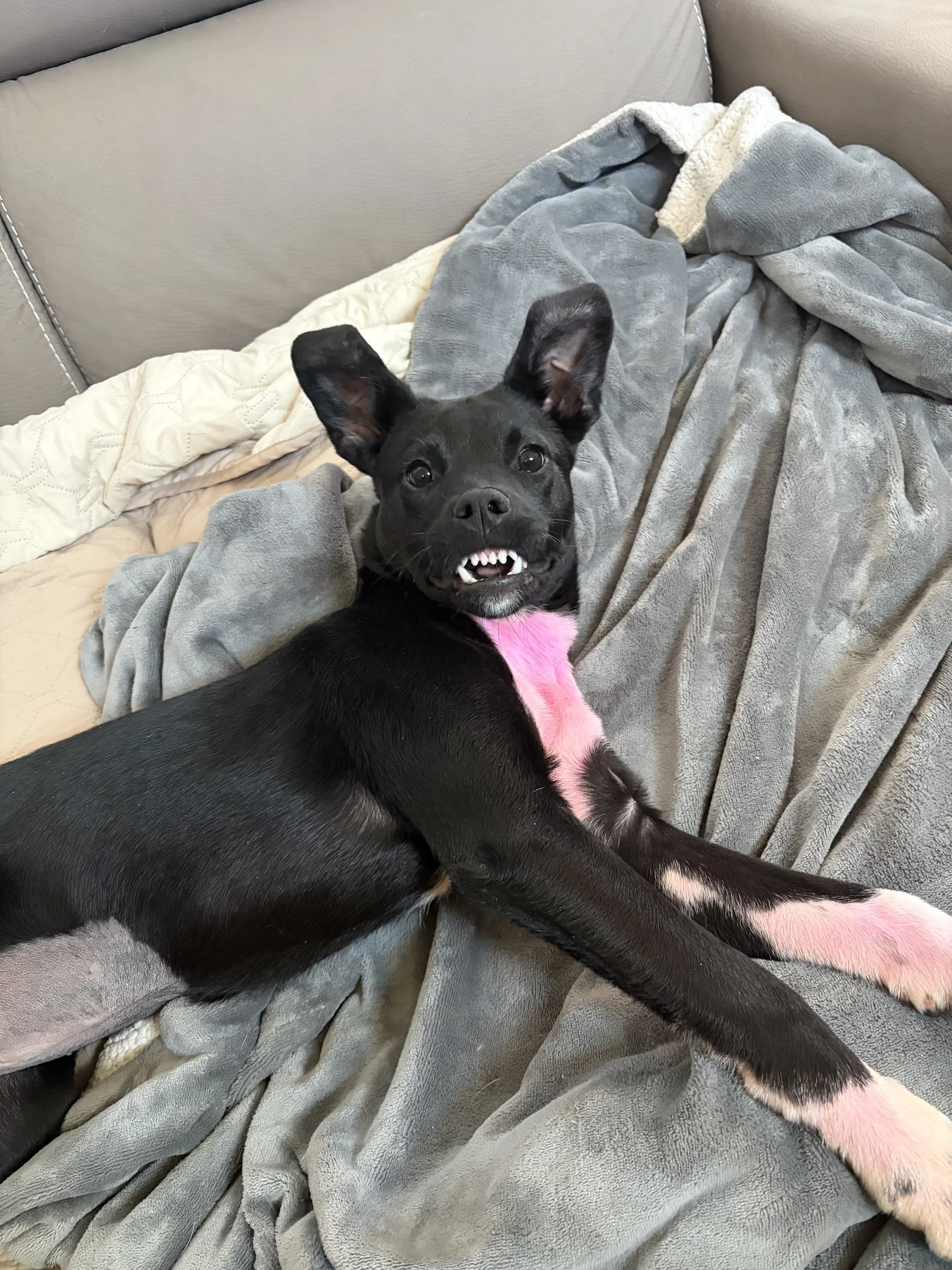 Elle is as unique as they come. With her stunning black coat and unmistakable pink coloring, she’s truly one of a kind. We may not know exactly why she’s pink, and we may not know her exact breed mix — but one thing is certain: she’s unforgettable. Around here, we’ve lovingly dubbed her a Unicorn Mix, because honestly… it just fits. 🦄💖