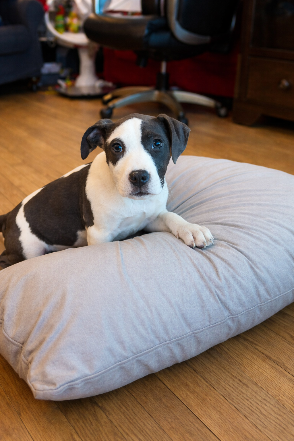 Patch has been well socialized and does wonderfully with other dogs, cats, and children. He is content in his kennel when needed and is already working on important puppy skills including potty training, leash training, and basic commands. For his age, he is attentive, responsive, and clearly enjoys learning — especially when it means spending time with his humans.