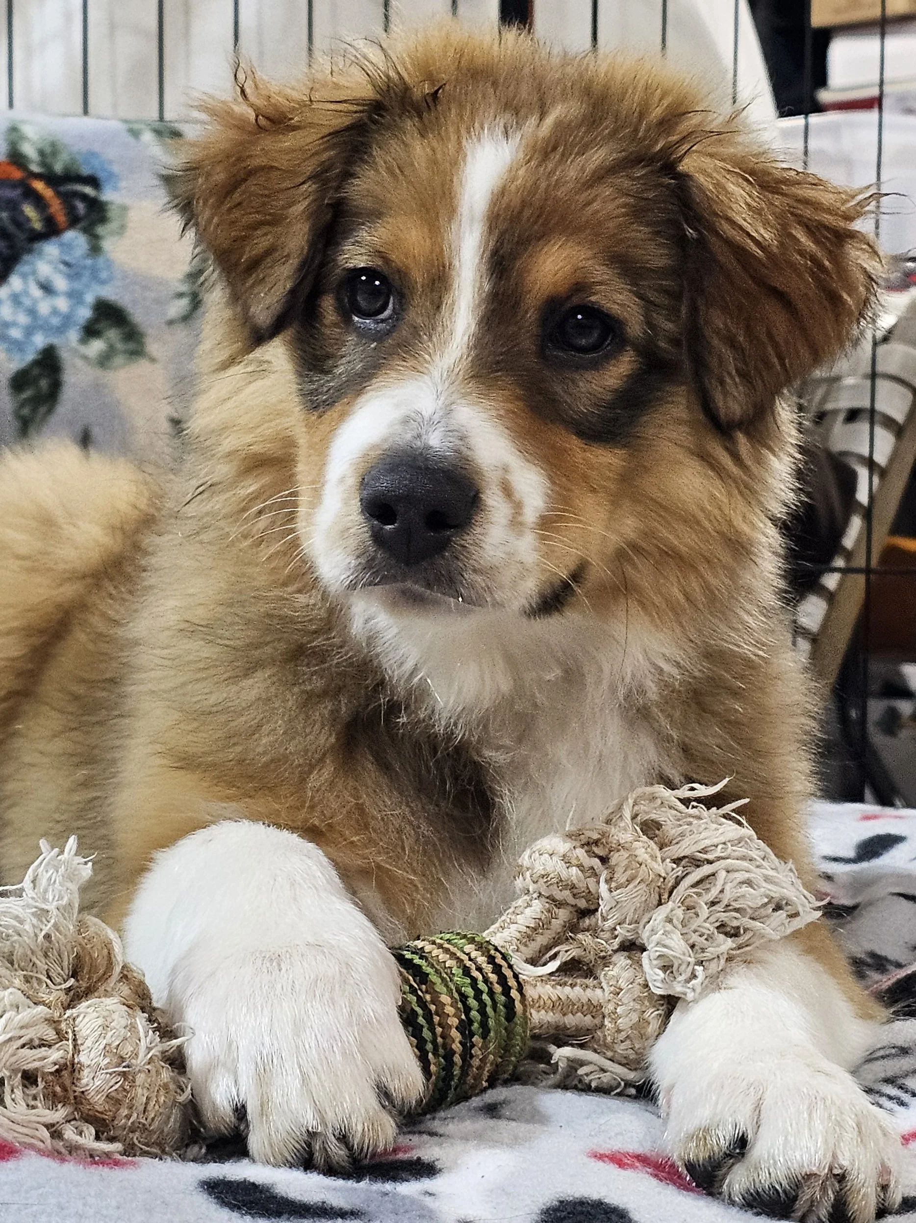 This handsome pup is labeled as an Aussie mix, but based on his build and overall vibe, we believe there may be a larger breed in his mix as well. Mac has that big-dog confidence even as a baby, and we expect him to grow into a solid, family-sized best friend.