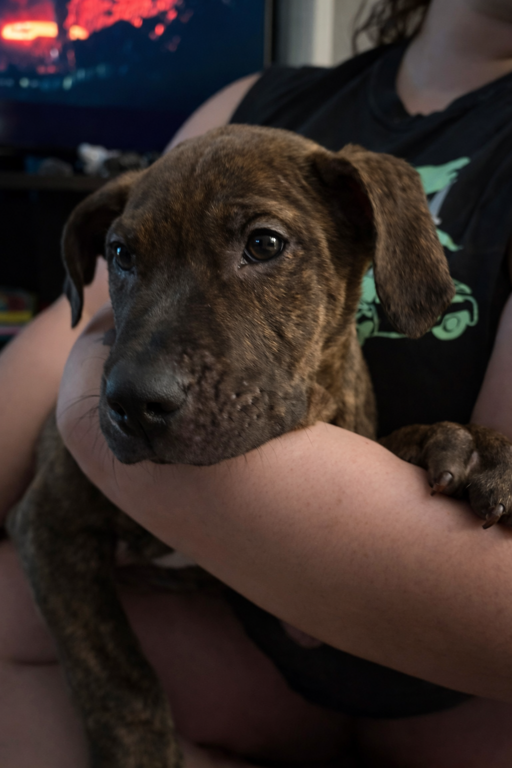 At 14 weeks old, Creek strikes a wonderful balance between playful and calm. She enjoys playing with toys and romping around with other dogs, but when the excitement winds down, she’s ready to settle in for serious cuddle time. Creek is a big snuggler who thrives on connection and companionship, making her a joy to have around.