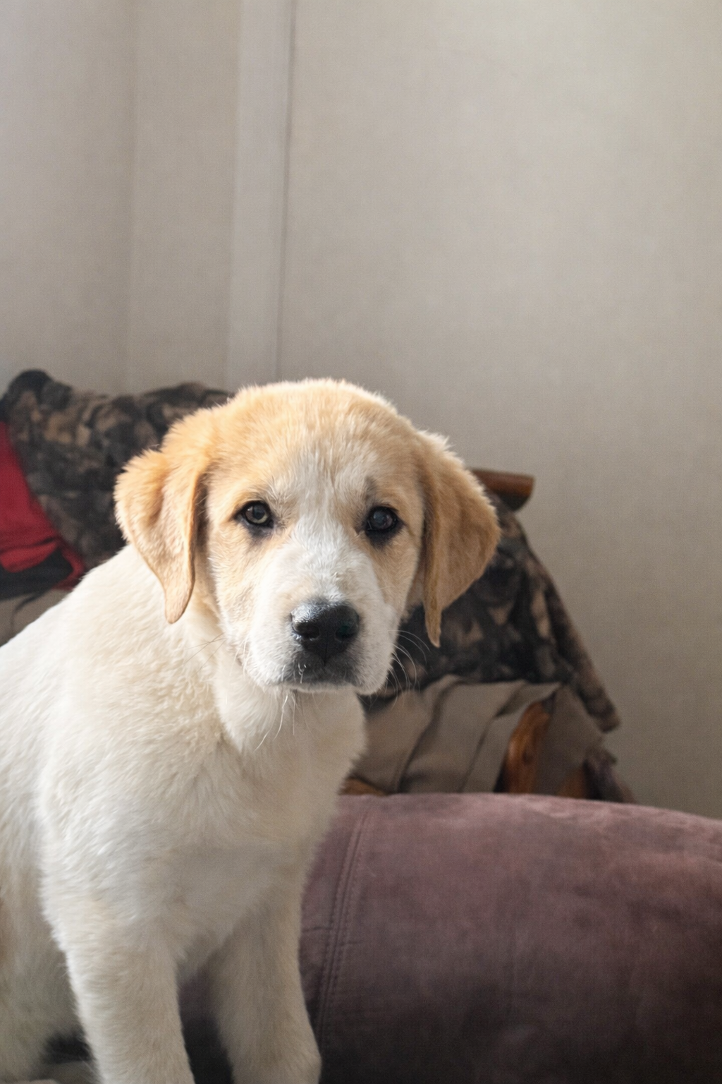 We suspect Eddie may be a Great Pyrenees mix, possibly with some Anatolian Shepherd in his lineage. His sturdy build and calm, observant nature suggest he may grow into the kind of dog who watches over his family with quiet confidence and steady loyalty.