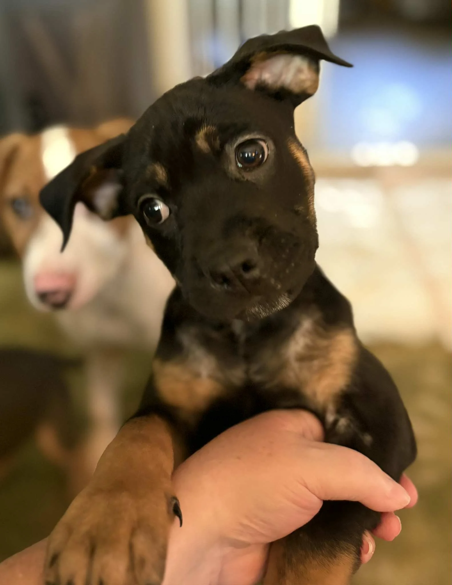 Peeta is a 9-week-old mixed breed puppy who is as lovable as he is charming. While we believe he is primarily a pittie mix, there are hints of another breed in his features—possibly Rottweiler or Doberman. Whatever his mix may be, one thing is certain: Peeta is 100% sweet, affectionate, and ready for a loving home.